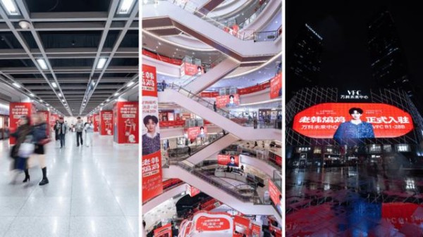 官宣同期,老韩煸鸡还包场近千平地铁广告、上海地标商业体全馆广告位、城市户外巨幅广告,抢占路过消费者的眼线。这样一次集中式的城市曝光,让原本只存在于粉丝圈层的内容,开始向更广泛的消费群体扩散。