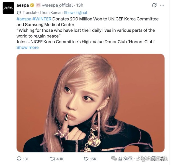 韩国联合国儿童基金会方面也进一步说明,这笔1亿韩元善款将用于战争及灾害地区儿童的身体和心理治疗,以及营养、保健等成长支持项目。随着这次捐赠完成,WINTER也正式加入该机构高额捐赠者组织“荣誉俱乐部”。这意味着外界对她的印象,不再只是舞台上的高人气爱豆,而是开始延伸到长期公益参与者的身份。