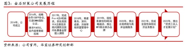 金石财策成立于2014年,是一家面向高净值客户,以专业咨询驱动的财富与投资管理顾问机构。公司已完成美国金融科技上市公司PINTEC品钛A轮、国投泰康信托B轮融资,具备中国证券投资基金协会颁发的私募基金管理人牌照和美国证券交易委员会颁发的RIA注册投资顾问牌照。截至目前,公司已经在北京、上海、杭州、深圳、成都、重庆、青岛、济南等地设立财富管理中心,在美国设立子公司,在新加坡设有联络处,总部中后台员工50位,前台咨询顾问104位,预计今年年底将达到235位,计划明年前台顾问规模达到300位。