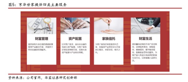 除财富管理和资产配置外,公司还提供家族信托以及财富生活业务,包括定制的不动产投资筹划、法税筹划、保险规划、留学规划等综合服务。所服务客户的资产规模区间较大,涵盖一两百万的普通资产配置客户,也有资产上亿的家族客户。收费模式上,京华世家也按照业务模式不同采取了多种不同业绩提取方式。对于全权委托模式的资产管理业务,主要还是以固定费用加上资金负责人分成(Carry)的模式;对于财富管理咨询类的业务,主要采用按照时间收费;股权项目类业务按照规模收取管理费。