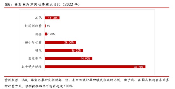 根据我们2023年9月20日发布的报告《从美国注册投资顾问的过去、现在看中国买方投顾的未来》中对于美国RIA的描述可以看到,2022年美国财富管理市场的投顾公司主要收费方式为“按照资产管理规模收费”、“固定费率”、“按照绩效收费”和“按小时收费”四种模式,以“佣金”为主体的收费方式只占2.2%,远低于前述四种模式。所谓“买方”,区别于“卖方”最主要的差别就是代表谁的利益,如果财富管理机构的主要收费依然来源于产品供给方也就是卖方的话,那它的“买方投顾”特征就不明显。