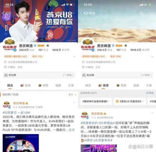 燕京啤酒官方微博首页变更前后