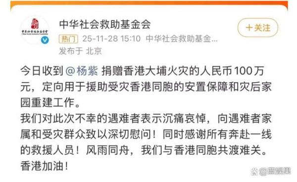 11月28日,中华社会救助基金会晒出的两笔100万捐款记录,揭开了这场"无声"的善举。没有通稿轰炸,没有话题营销,杨紫用个人账号直接转账,张艺兴通过工作室默默出资。备注栏里冷冰冰的"香港大埔火灾救助"几个字,却比任何公关文案都烫心。