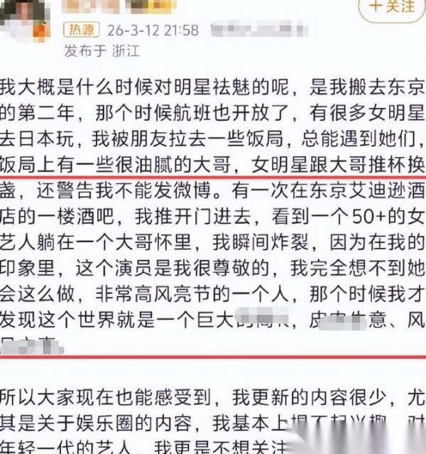 当然,不止年轻小花有故事,就连资深女演员也难逃八卦泥淖,有网友现身说法称亲眼目睹某位五十多岁的女演员依偎大佬怀中,“我很尊敬她,却没想到她会那样”,名单甩出来,全是曾经德高望重的名字,更有人直接点到林志玲身上,只不过后续视频只有声音没画面,很快这波热度就散了,但谁敢保证,下一个轮到谁?
