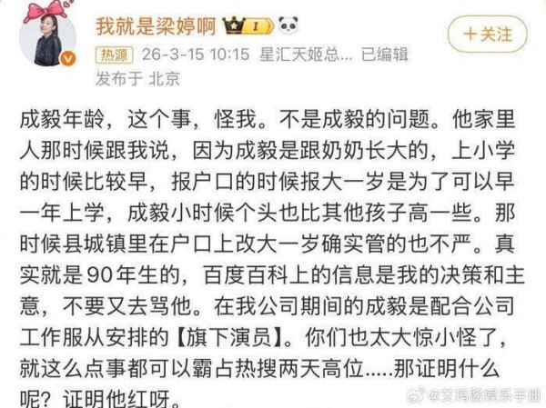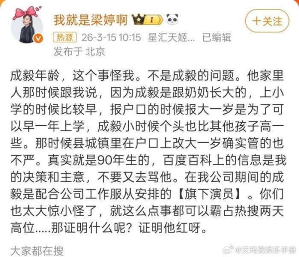 这两天,娱乐圈最让人津津乐道的新闻,无疑是成毅的年龄罗生门。事情之所以爆炸,源于前经纪人梁婷的自曝,把这个原本似乎微不足道的争议,一下子推上了热搜榜首。原来所谓的改年龄,背后竟是奶奶的一番苦心——为了让孙子早一年上学,她在户口上多报了一岁。这种带着浓浓年代感的小操作,放在2026年的娱乐圈里,却像一颗炸弹般引起轩然大波,让人忍不住回想起那个年代的生活逻辑。