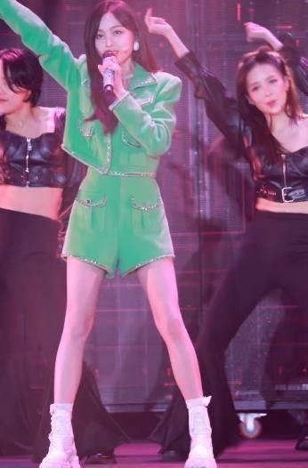 但更加令人瞩目的是吴宣仪的舞台表演。作为一名专业的艺人,她展现出了扎实的唱跳功底,每一个动作都充满了魅力和张力。尤其是当她换上了利落的绿色套装和马丁靴时,整个人仿佛散发着无穷的活力,每一个动作都带着一种不可抗拒的魔力。