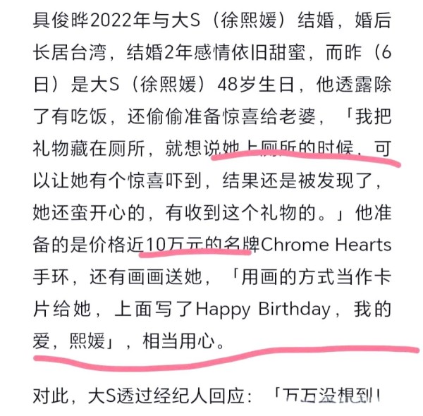 具俊晔给大S庆48岁生日!送10万手镯在厕所准备惊喜,大S开心回应大 S 与具俊晔的幸福生活:代言续约与生日惊喜