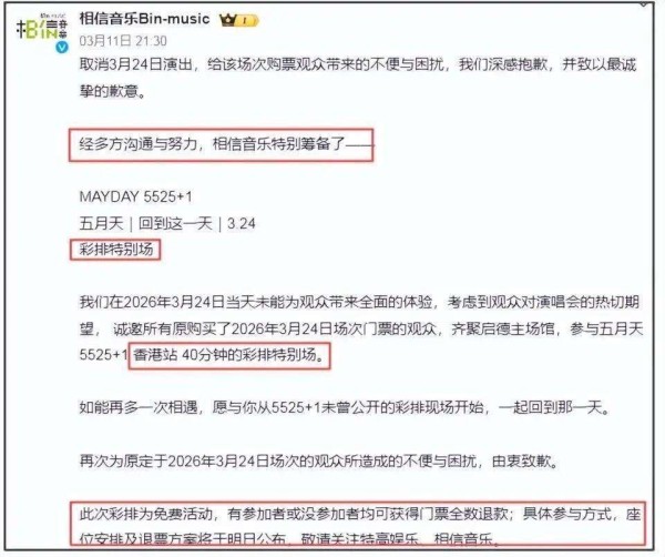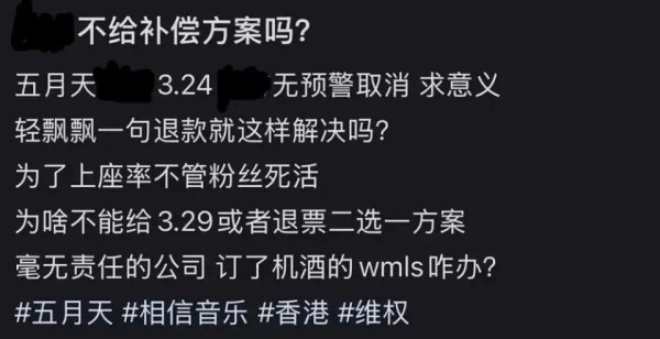而五月天方面最终的补偿方案,显然并没有得到大众的认同。虽然在24号安排了一场40分钟的彩排,但这一场彩排显然无法弥补演唱会取消给粉丝带来的失望与损失。更令人感到困惑的是,这一勉强的解决办法居然是在网友质疑声日益增大的情况下才急忙推出的,显然是为了应对舆论压力而仓促制定的应急方案。