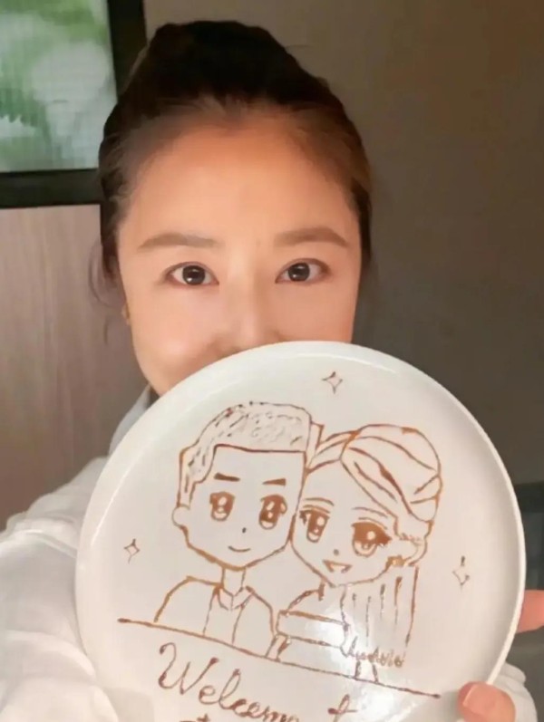 林心如在烤肉店收到了一份特别的礼物:一幅她和霍建华的卡通画像。 她拿着画像左看右看,笑得像个孩子,立刻把这份惊喜分享到了社交平台。