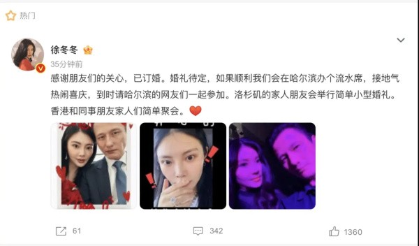 而后续也将会洛杉矶举办小型的婚礼,在香港简单的聚会,足矣看得出徐冬冬已经是将的两人的后续安排的明明白白,