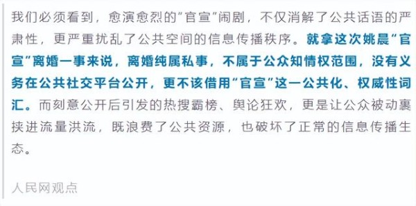 人民网评姚晨“官宣”离婚:“所谓官宣”被严重扭曲成收割流量红利“密码”,反复霸榜,浪费公共资源人民网评姚晨“官宣”离婚:离婚纯属私事,没有义务公开,“所谓官宣”成收割流量红利“密码”,浪费公共资源