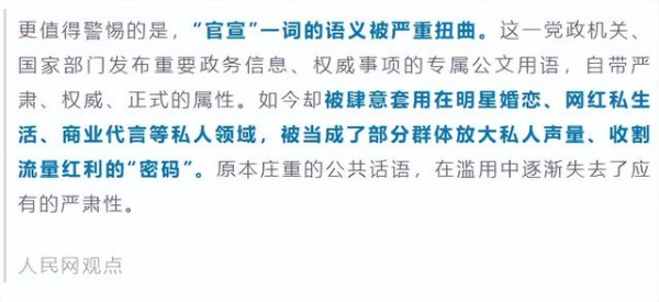 让“官宣”回归专属权威发布的本真含义;让公共舆论空间摆脱流量绑架,重回清朗有序的状态;让真正有价值的公共信息,能够被公众看见、关注……需要全社会形成共识,共同发力。是时候整治这股“所谓官宣”的乱象了!