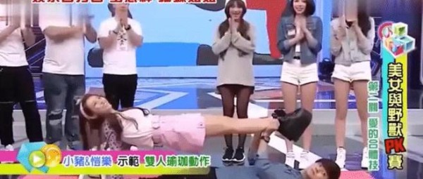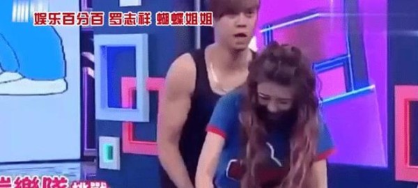 第一个就是罗志祥和简恺乐共同主持的《娱乐百分百》现场,当时节目组设置了一个游戏环节,节目中罗志祥和简恺乐更是自告奋勇亲自做示范,游戏中罗志祥躺在地上,然后罗志祥用手托着简恺乐的脚,简恺乐用双手按到地上,而其中最不可思议的一幕出现了,正当导演在倒计时的时候,简恺乐却突然用屁股坐到了罗志祥的腹部,这样的一幕的确非常尴尬,两人当时也是相视而笑了一下。