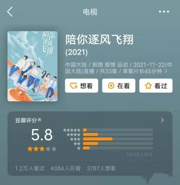 《陪你逐风飞翔》豆瓣开分5.8,这在今年现代偶像剧中属于领先的佼佼者。在收官当日,腾讯视频的累计播放量达到7.57亿,后续还有上涨的空间,其中微博话题阅读量和讨论量也在节节攀高。每日的播放量也在持续走高,收视率一直稳居前三,也属于一匹小黑马!