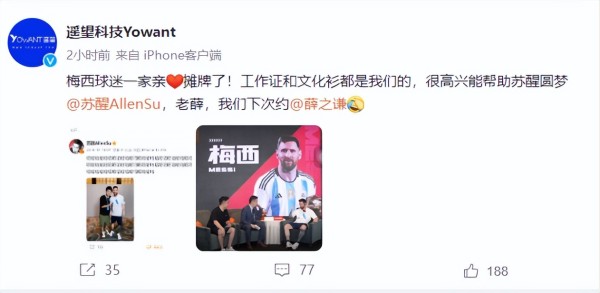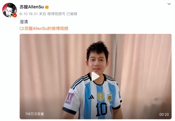 据悉,苏醒是梅西的铁杆粉丝。6月10日,梅西携阿根廷队抵达了北京,苏醒还曾发布视频澄清自己并未接机。