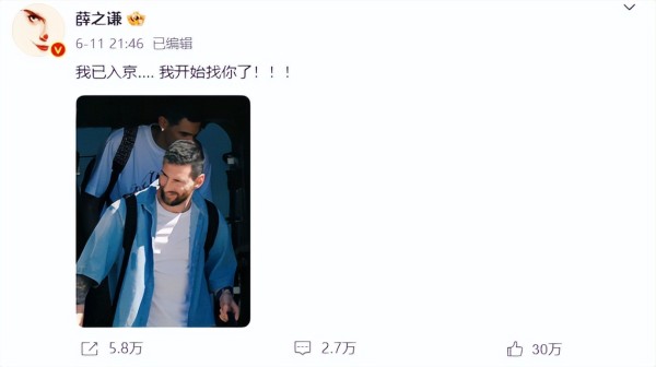 6月11日,歌手薛之谦曾发文称,自己已经来到北京,准备开始找梅西了。