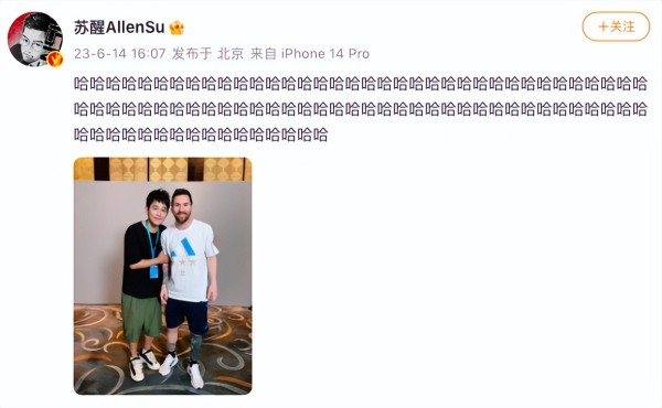 据点时新闻报道,6月14日,苏醒晒出了自己与“球王”梅西的合影,更是配文88个“哈”,字里行间尽显兴奋和激动。