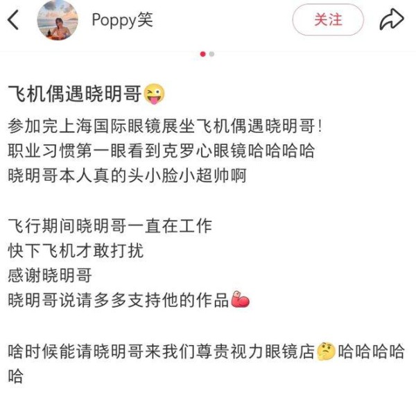 3月4日,一则明星偶遇的消息悄然在社交平台走红,瞬间温暖了无数网友的心——有位网友发文透露,自己在参加完上海国际眼镜展后,乘飞机返程时意外遇见了黄晓明,并晒出了一组亲切的合影。照片中每一个细节都透露着惊喜,同时让人不自觉地为黄晓明的低调与魅力心生敬意。