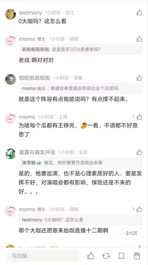 近日,一则关于《歌手2026》首发阵容的内部消息在网络上迅速扩散,引发了广泛的关注。根据多个流出的聊天记录截图显示,本季的首批演唱者名单基本已经确定:王赫野、周兴哲、王铮亮、刘惜君和希林娜依高。这个名单一经曝光,便在社交平台掀起了热烈的讨论。大量网友涌入评论区留言,纷纷表示太冷清了辨识度偏低广告主会买单吗?等质疑声音不断。