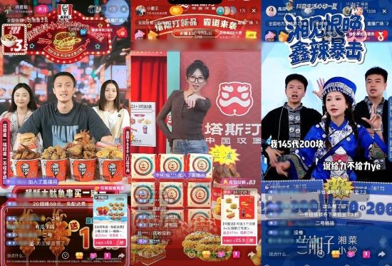 在抖音有超过1700万粉丝的舞蹈达人@小霸王 在推荐塔斯汀中国汉堡的直播间大秀舞技,吸引大量网友围观,直播间曝光人次超过5000万,单分钟交易峰值超过4.7万元;抖音音乐人@鑫淼 则身着民族服饰和其他主播团播跳舞,内容流量快速转化为交易数据,为湘菜连锁品牌兰湘子带去超过27万张团购订单。