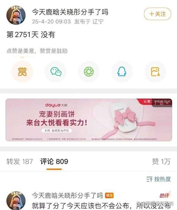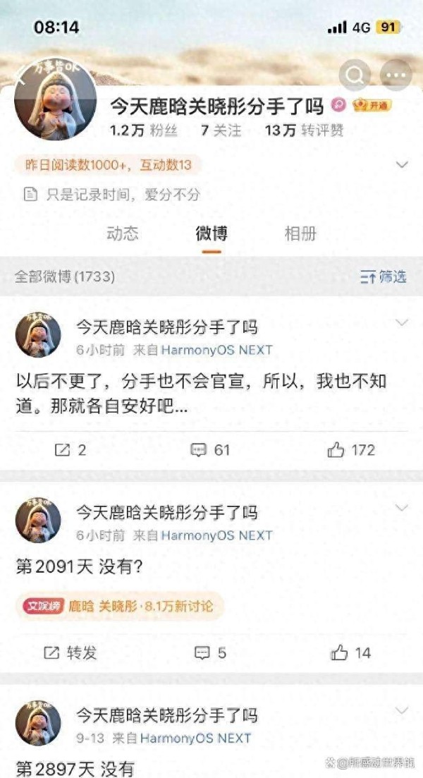 说起来,这博主也真是个奇人。也不知道从什么时候开始,每天坚持打卡,就问一句:“今天鹿晗关晓彤分手了吗?” 这一问就是好几年,风雨无阻,简直比闹钟还准时。