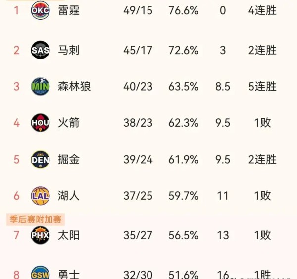 现在整个西部,明明白白就是两极分化的局面。第一梯队就是雷霆、马刺、森林狼、火箭、掘金这五支队伍,个个状态稳定,赢多输少,早早锁定了季后赛席位的有利位置。湖人、太阳、勇士这三个全联盟流量最高的队伍,反倒挤在附加赛边缘苦苦挣扎,每一场比赛都输不起。