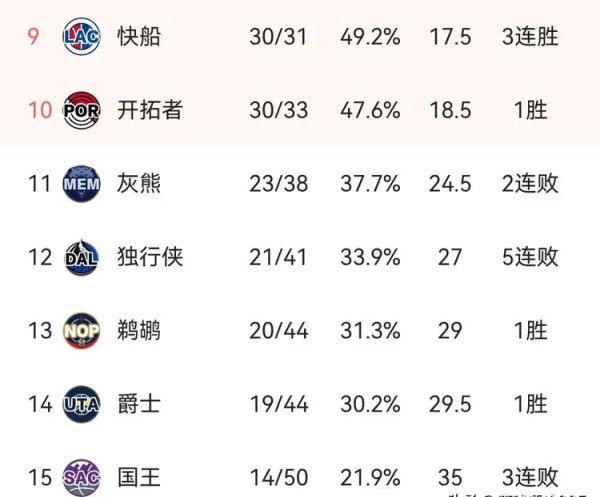 这三支队伍哪一个不是粉丝一大堆,大家都等着看他们进季后赛呢,结果现在天天在危险区晃悠,看得粉丝心跳都快停了。毕竟只要连着输个两三场,排名就直接掉下去,想再追回来可不容易。而独行侠、国王这些队伍,就彻底掉队了,现在基本已经没了冲季后赛的希望,早早开始为下赛季做打算了。