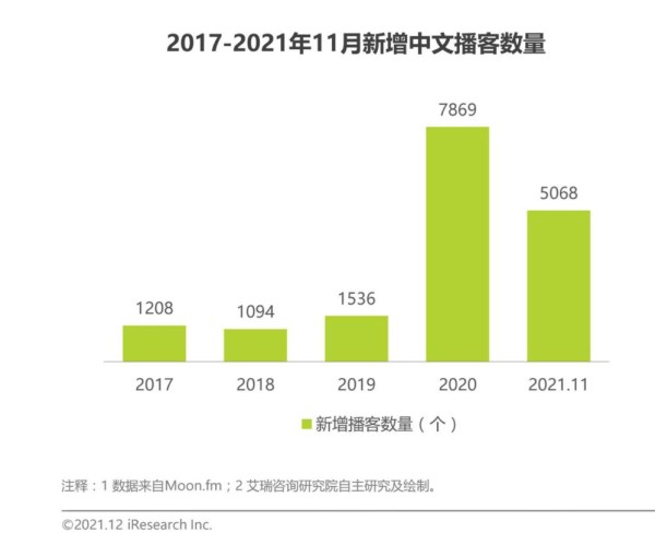 艾瑞咨询的数据显示,整个2020年中文播客新增7869档,是中文播客历史上新增播客最多的一年,日增达21档。