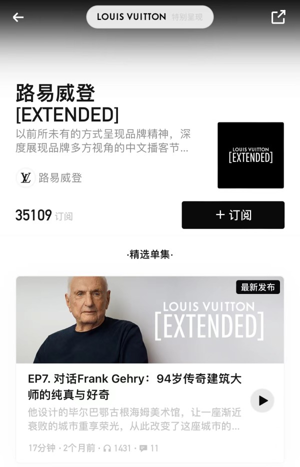 奢侈品入驻播客就是一件符合品牌调性的事情,奢侈品牌和播客的用户群体极为吻合;另一方面,播客的叙事方式正是播客所需要的,可以让品牌价值进一步延伸。