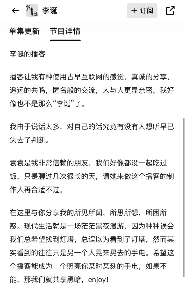 李诞在播客的介绍里写道:“播客让我有种使用古早互联网的感觉,真诚的分享,遥远的共鸣,匿名般的交流,人与人更显亲密,我好像也不是那么‘李诞’了。”
