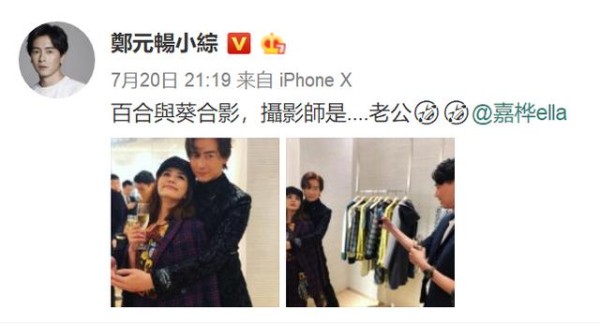7月20日晚,ELLA陈嘉桦在微博上晒出自己与郑元畅在后台的亲密合照。照片中,ELLA手拿香槟微微仰头靠着郑元畅,郑元畅从背后环抱着她,画面很美却总觉有些别扭。