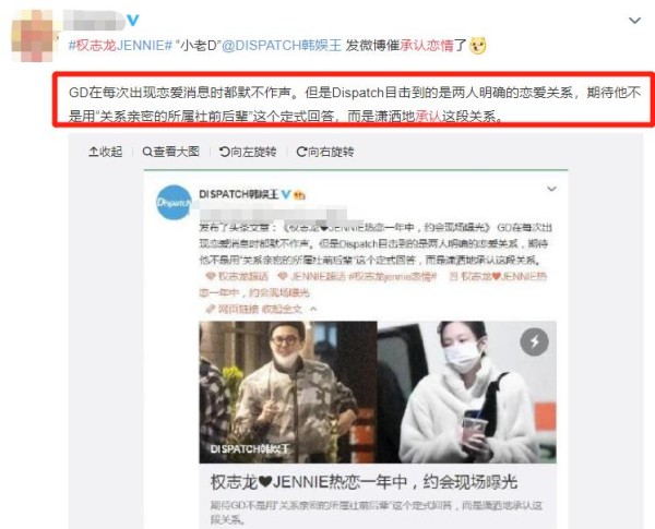 而且网友纷纷猜测二人的恋情是真的还是假的,韩国媒体曝光gd权志龙大方承认恋爱关系,所以说gd权志龙的作法还是很洒脱,和女星传出桃色新闻,立刻承认恋爱关系确实很爷儿们。