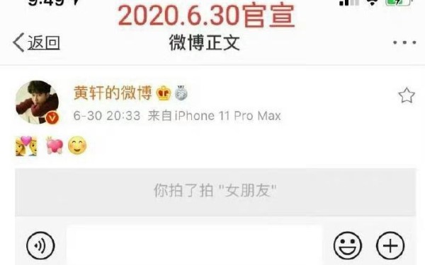 然而,细心的网友们很快就发现,其实黄轩早在**2020年6月30日**就曾经暗示过自己的恋情。当时,他在社交平台上发布了一条动态,写着"你拍了拍女朋友"。