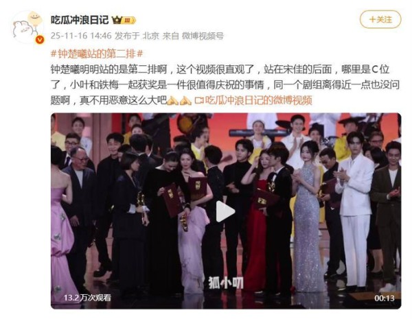 刚刚捧起金鸡奖最佳女配角奖杯的钟楚曦,可能没想到,紧随荣誉而来的是一场关于合影站位的全网“显微镜”式审判。颁奖典礼上的集体合影环节,让她瞬间站上了舆论的风口浪尖。