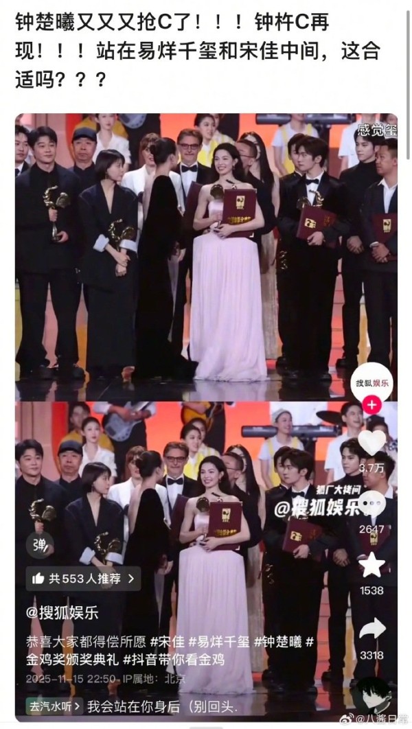 这波操作让许多人瞬间梦回2025年10月的VOGUE盛典。当时,她因站在刘亦菲与杨幂中间,被贴上“钟杵C”标签,批其“无作品抢C位”。此次金鸡风波,自然被视作“钟杵C”事件的延续,不少质疑声直指其“习惯性抢镜”。