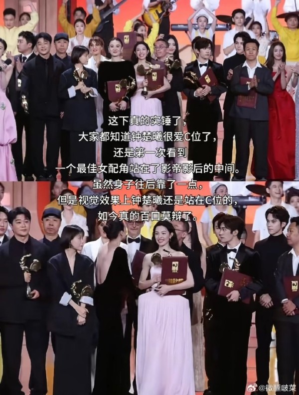 钟楚曦金鸡奖颁奖典礼合影站位引争议,网友:她站的是第二排