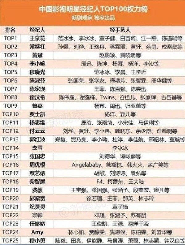 最近新出了一个经纪人的有关排名。王京花当仁不让的坐上了第一的宝座。像范冰冰,李冰冰,白百何,董子健。在娱乐圈王不见王的“双冰”,原来还有这么一层关系。