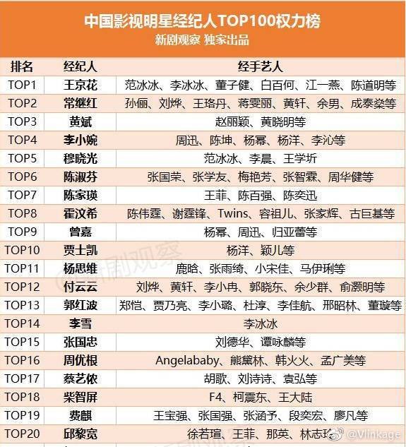 最近,中国影视明星经纪人权力榜出炉了,看看前20的经纪人都带过哪些明星?