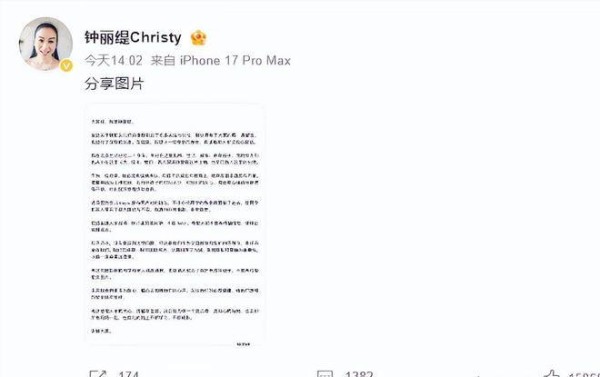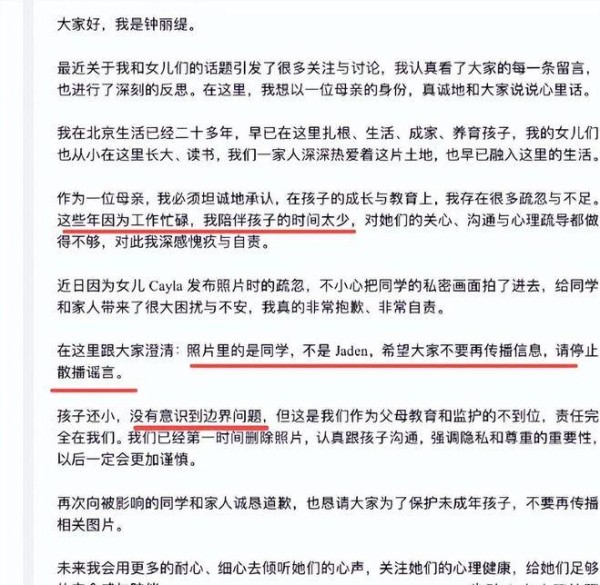 随着网络上的质疑声越来越大,事态愈发失控,钟丽缇终于站出来发布长文回应。她先是澄清,照片中的人并不是她的二女儿Jaden,而是考拉的同学,并且立即把责任揽到了自己身上。她表示,自己常年忙于工作,未能做好孩子的教育和监护,孩子年纪尚小,未能意识到隐私和边界问题,并且已第一时间删除了照片,同时向被波及的同学和家人郑重道歉。除此之外,钟丽缇还特别提到自己已经在北京生活了20多年,深爱这片土地,试图化解外界对她身份和立场的质疑。