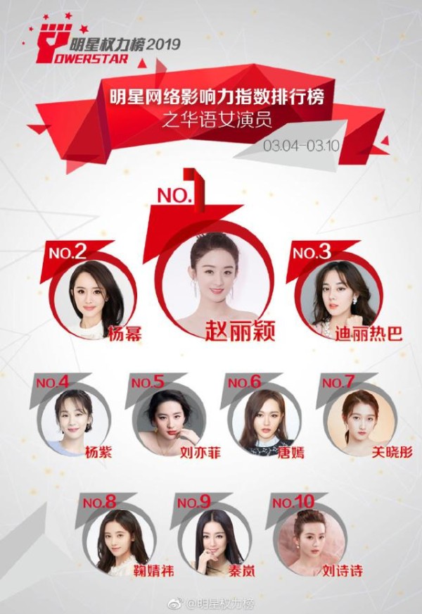 明星影响力排行榜,迪丽热巴蝉联八周第一,杨幂第二,赵丽颖第三