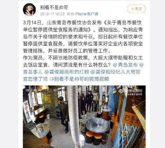 此前龚俊在网上被人爆出不遵守防控规定,和钟楚曦等同剧组人员堂食。