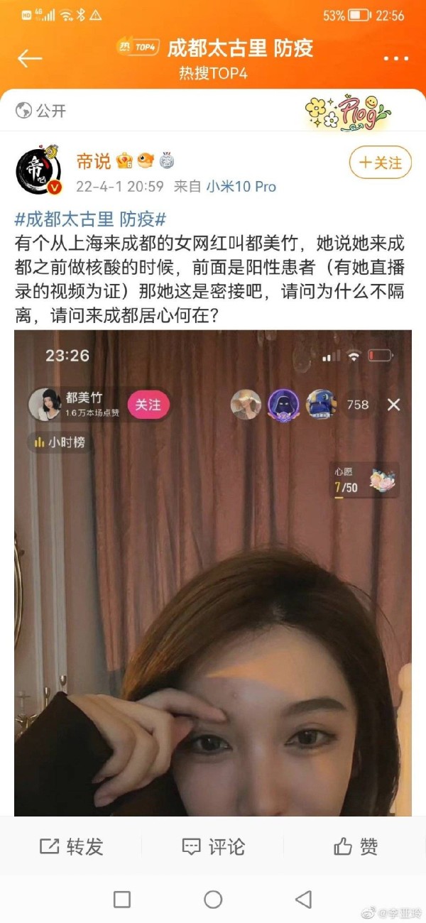 网红都美竹在直播间里大秀自己身为大网红的特权事迹让网友一下点爆了脾气。都美竹声称自己在上海遇到阳性患者却不需要严格按照隔离的规定,反而在直播间里问网友们成都哪里好玩,利用这些吸引眼球博关注。