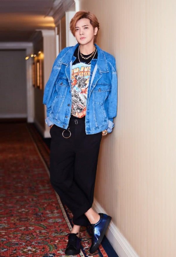 在某活动中,罗志祥身穿一件蓝色的牛仔外套,里面搭配着一件黑色的印花T恤,他还带着两条链子,显得相当有个性,下身穿着一条黑色的宽松休闲裤,脚踩一双宝蓝色的休闲鞋,这身穿搭显得整个造型既有个性又很休闲!