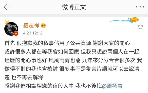 随后罗志祥也发文回应称有许多事解释不清楚,也不想解释,认识她也不后悔。