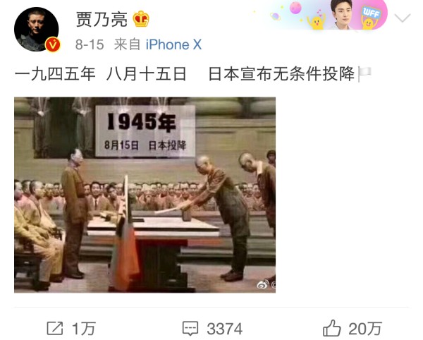 也许是因为饰演了一个军人,让贾乃亮对军人更为敬佩。在大家在关注娱乐圈的各种花边新闻时,贾乃亮不同于其他明星发布了一条庆祝日本投降纪念的动态。贾乃亮也是娱乐圈中少有的庆祝日本投降的明星之一