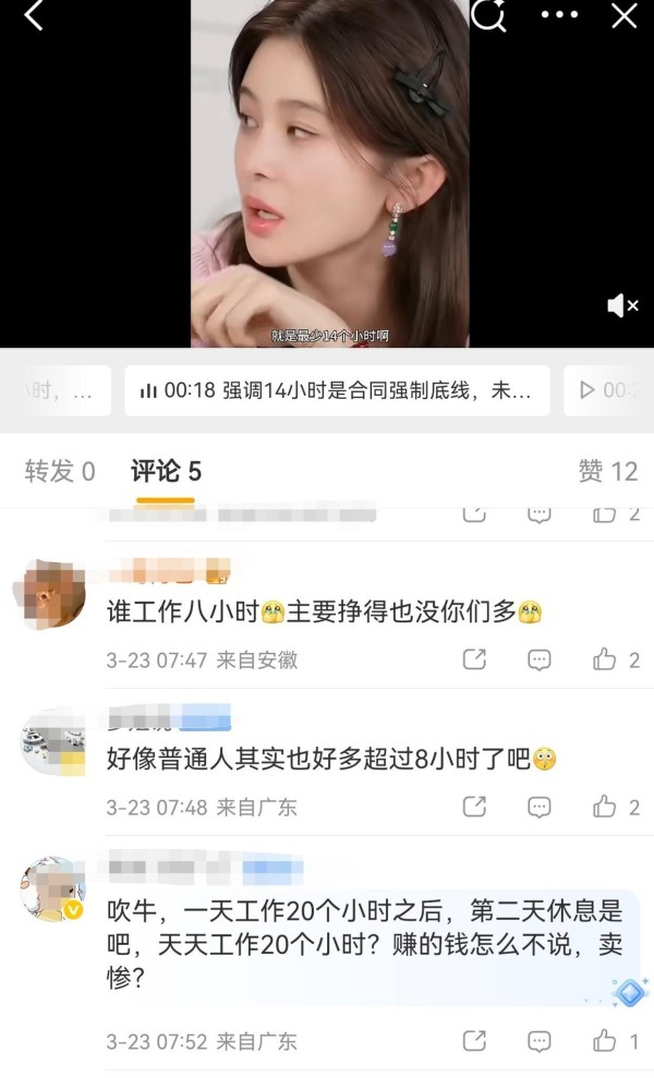 更关键的是,她这话暴露出来的不是演员辛苦,而是行业里那个残酷到不行的等级分化。她说的“有资格”签这种合同的人,言下之意就是咖位够、名气大、能跟资方谈条件的那拨人。这类演员拿的是保障性合同,14小时起步,超时有钱,干不够还拿不到钱——注意,是“干不够拿不到钱”,不是“超时有加班费”,这本身就够魔幻了。可她紧接着补了一句,没资格签这种合同的,“时间就没谱了,24小时随叫随到”。这句话才是真正扎心的地方。那些没名气的演员、群演、小角色,连个保底的工作时长都没有,资方什么时候喊你什么时候到,可能拍一天给一天的钱,也可能等了一天啥也没拍着,白跑一趟。