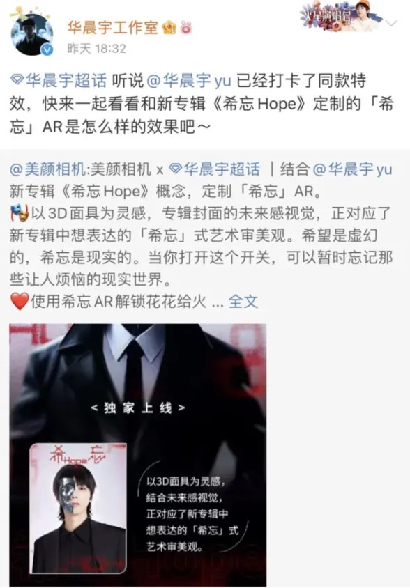 图 3:华晨宇工作室发博文号召网友们一同体验定制「希忘」AR