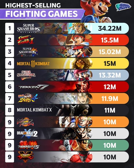IT之家 11 月 24 日消息,一份最新榜单显示,任天堂的格斗游戏《任天堂明星大乱斗特别版(Super Smash Bros Ultimate)》以超过 3500 万的销量,稳居史上最畅销格斗游戏榜首,远超其他竞争对手。