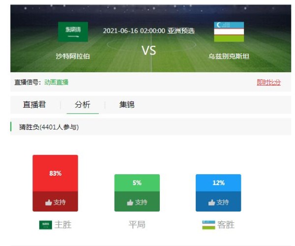 对阵乌兹别克斯坦,沙特阿拉伯历史战绩处于上风,两队在世预赛交手5次,沙特阿拉伯一共赢下3次,打平1次,输了1次。在本届预选赛首回合,沙特阿拉伯正是3-2击败乌兹别克斯坦,得以在积分榜上压制对手,掌握了竞争榜首的主动权。不过,沙特阿拉伯的小组第一可能会被抢走,只要乌兹别克斯坦全取三分,D组领头羊将会易主。这样的较量,可以说是最终决战,谁也输不起,赢球的一方可以拿到直接晋级12强的门票。
