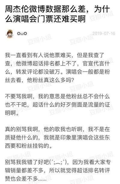 7月16日晚,有网友发帖问:“周杰伦微博数据那么差,为什么演唱会门票还难买啊?”发帖者称:“我查了查,他微博超话排名都上不了,官宣代言什么,转发评论都没破万。演唱会一般都是粉丝去看,他粉丝真这么多吗?”
